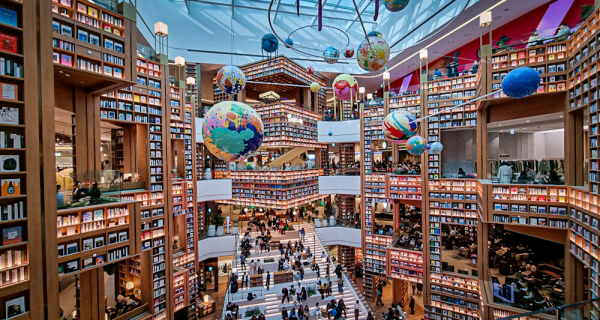 tempat acara budaya, di lantai 2 COEX Mall, dengan rak buku se,nggi langit-langit. Berbelanja di